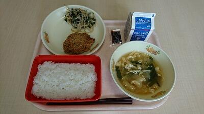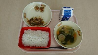 今日の献立は、ご飯、いかの天ぷら、おかか和え、豆腐となめこの味噌汁、牛乳でした。
