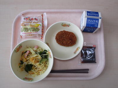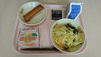 今日の献立は、冷やし中華、春巻き、かぼちゃのマフィン、牛乳でした。