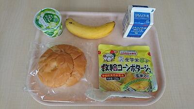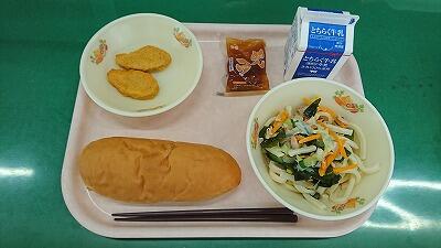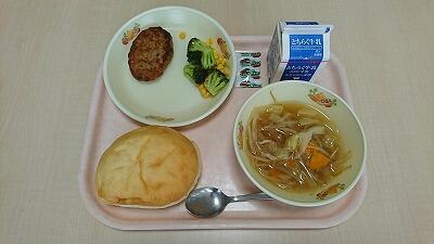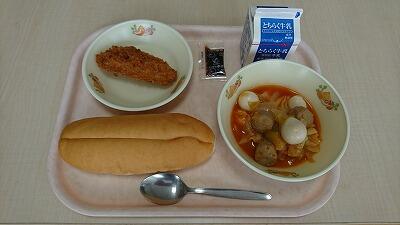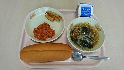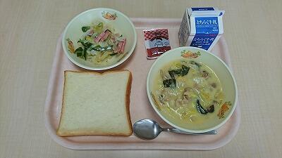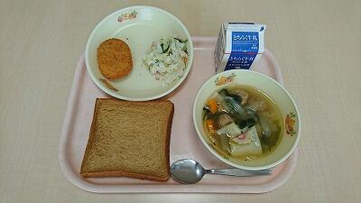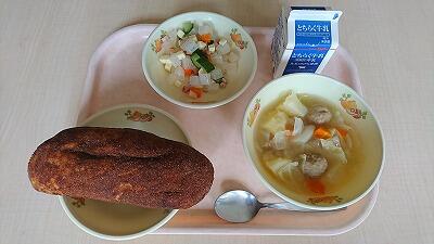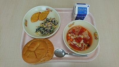 今日の献立は、バターロール、チキンナゲット、ミネストローネ、ほうれん草のサラダ、牛乳でした。