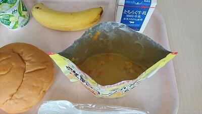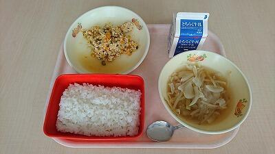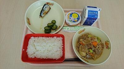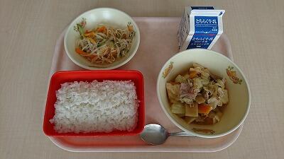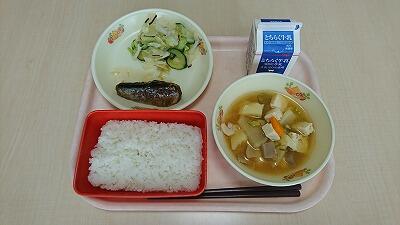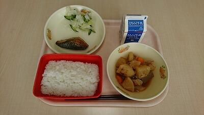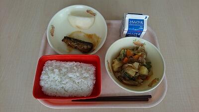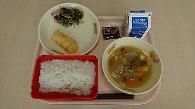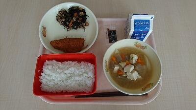 今日の献立は、ご飯、あじフライ、五目煮、田舎汁、牛乳でした。