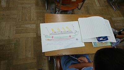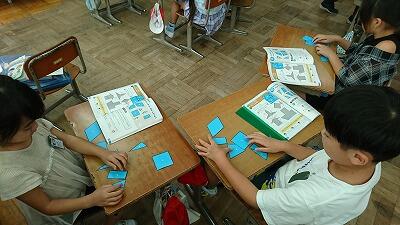 スイミーが仲間と共に、大きな魚の形になって泳ぐ場面を、紙の模型を黒板に並べて情景を想像しながら読みました。