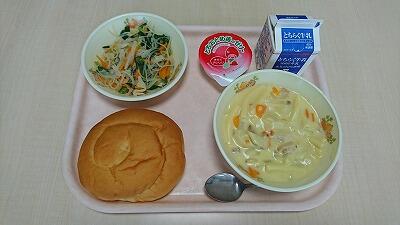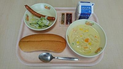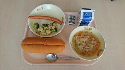 今日の献立は、ホットドック(ドックパン、ソーセージ、ケチャップ)、野菜スープ、花野菜サラダ、牛乳でした。