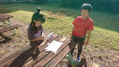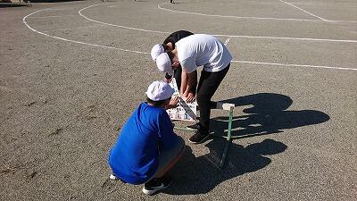 中庭で画用紙に棒を立て、時間ごとに影の動きを記録していきます。