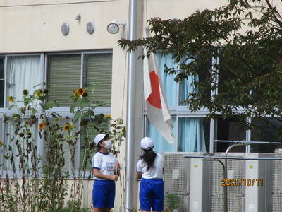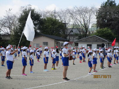 紅白に分かれ並び順を確認し、話しを聞くときや国旗掲揚のときの姿勢を練習しました。