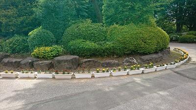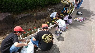 昼休みに、自然愛護委員会がプランターにマリーゴールドを植えました。