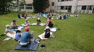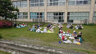 4時間目が終わると、用意された給食を持って外に出て、縦割り班ごとにまとまっていただきました。
