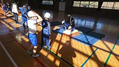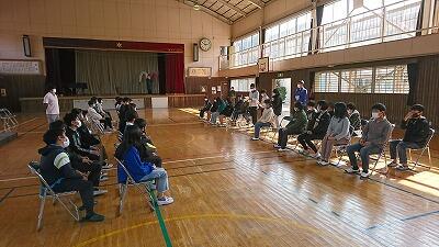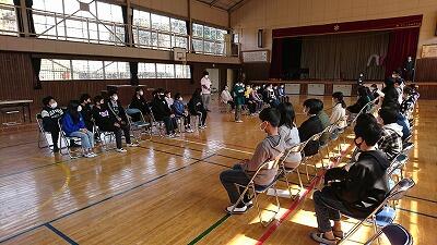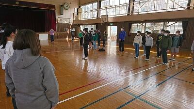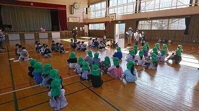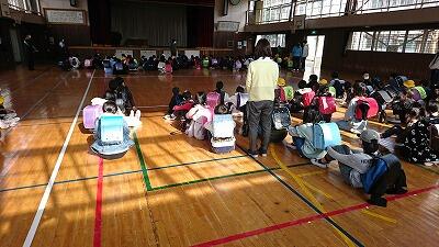 下校前に体育館に集合し、新しい通学班と安全な登下校について確認しました。