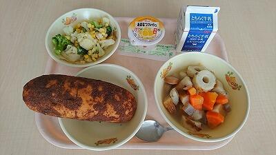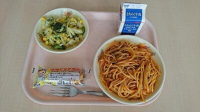 今日の献立は、スパゲティミートソース、イタリアンサラダ、米粉ドック(チョコレート)、牛乳でした。