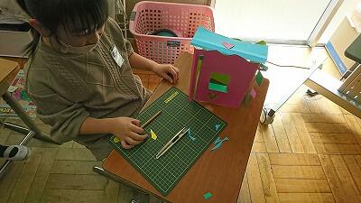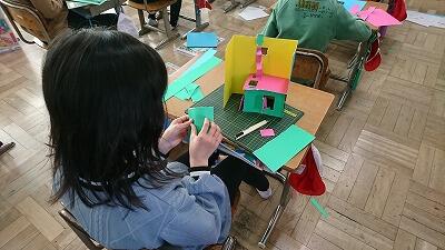 カッターナイフを安全に使って、窓のある自分だけの建物をつくろうというめあてで学習しました。