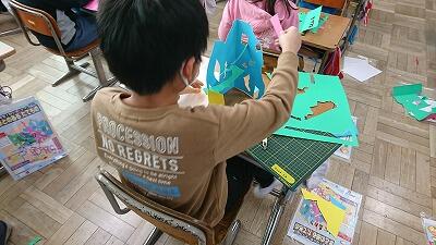 前の図画工作の時間に、カッターナイフの使い方は学習していたので、児童は思い思いの形を切り抜いて作品を制作しました。