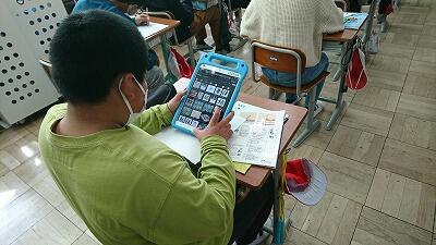 3年生が書写(毛筆)の学習をしているところにお邪魔したちょうどその時、ある児童の筆を洗った瓶が床に落ちてしまいました。