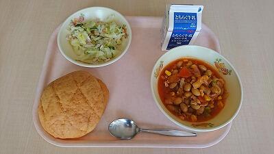 今日の献立は、メロンパン!、ポークビーンズ、ハムマリネサラダ、牛乳でした。
