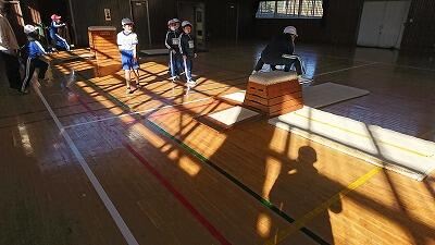 跳び箱の両側から跳び乗り、腕を使って進み、じゃんけんをします。負けたら降り、勝ったら進みます。
