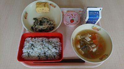 今日の献立は、わかめご飯、卵焼き、胡麻和え、石狩汁、いちごプリン、牛乳でした。