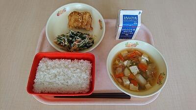今日の献立は、ご飯、鶏肉のから揚げレモンソースかけ、ナムル、吉野汁、牛乳でした。