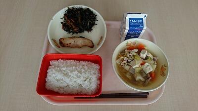 今日の献立は、ご飯、金目鯛の塩麴漬け!、磯煮、豚汁、牛乳でした。