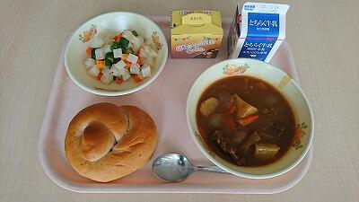今日の献立は、卒業お祝い献立で、いちご米粉パン、ビーフシチュー、カリコリサラダ、お祝いケーキ、牛乳でした。