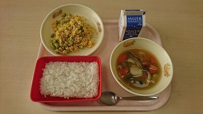 3学期最初の献立は、セルフ三色丼(ご飯、三色丼の具)、田舎汁、牛乳でした。