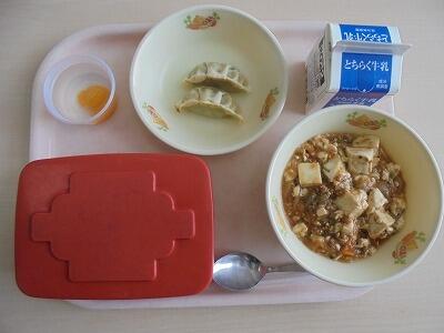 今日の給食の献立は、【ごはん・牛乳・麻婆豆腐・ぎょうざ・手作りゼリー】でした。