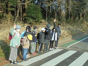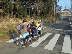 道路を横断するときは、全員が手を挙げ、班長の「右、左、右、横断」の声掛けの後、まとまって横断しています。