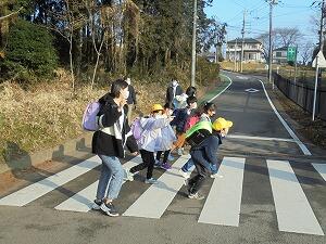 交通安全教室の後、そのまま下校となりました。早速、校門前で横断歩道の横断を実践しました。