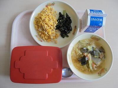 今日の給食の献立は、【ごはん・牛乳・三色丼の具・味噌汁】でした。