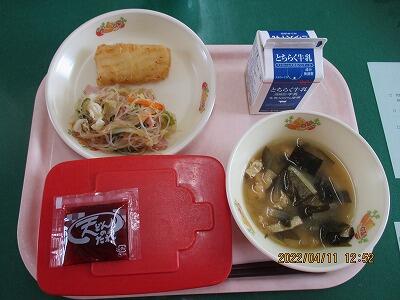 今日の給食の献立は、【わかめご飯・牛乳・鶏のから揚げ・キムチ和え・お祝い吉野汁・クレープ】でした。