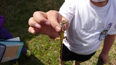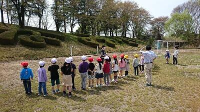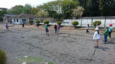 3時間目には、広い校庭を探検しながら、外で遊ぶ時のきまりを確認しました。