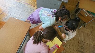 教室では、6年生のお兄さん、お姉さんに教えてもらいながら、朝の準備をしました。