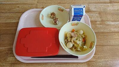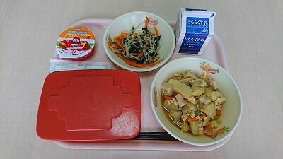今日の献立は、ご飯、親子煮、和風和え、アセロラゼリー、牛乳でした。