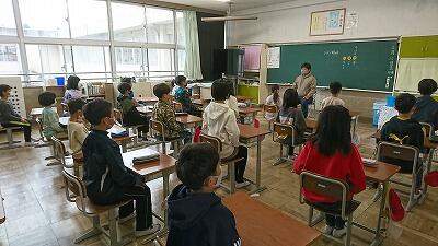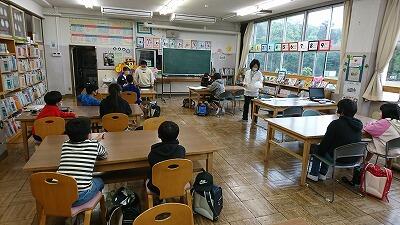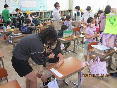 1年生の教室の様子です。引き続き6年生が朝の準備のお手伝いをしています。