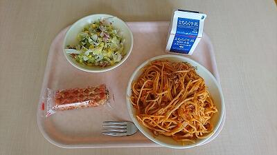 今日の献立は、スパゲティミートソース、フレンチサラダ、牛乳、(2~6年生にチーズドッグ)でした。