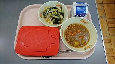 今日の献立は、大麦ご飯、ポークカレー、こんにゃくサラダ、牛乳、です。