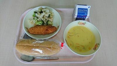 今日の献立は、パン、白身魚フライ、花野菜サラダ、コーンポタージュ、牛乳、でした。
