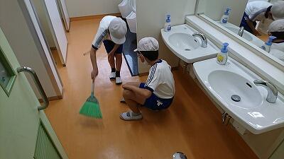 写真は昨年度改修してきれいになったトイレの清掃の様子です。「無言清掃」が合言葉です。