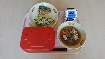 今日の献立は、ご飯、サバの味噌煮、キャベツの塩昆布漬け、けんちん汁、牛乳でした。