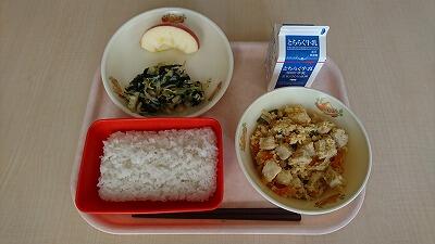 今日の献立は、塩(エン)ジョイランチで、ご飯、親子煮、海苔和え、りんご、牛乳でした。