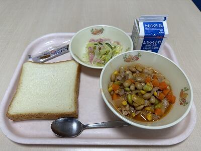 12月15日(金)の献立は、食パン(デキシーチョコ)、ポークビーンズ、ハムマリネサラダ、牛乳でした。