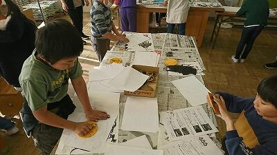 一つの版を複数回刷ったり、刷り上がった作品にスポンジなどで色を付けていきます。