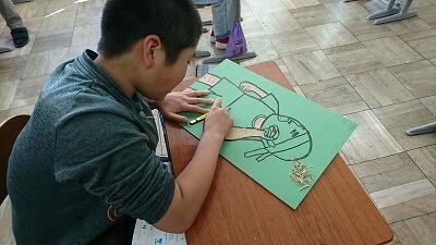 人物が主題なので彫る方向や使う彫刻刀などを工夫しながら制作しています。