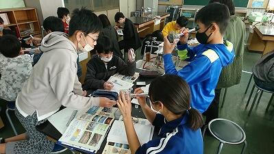 火山のはたらきを学んだあと、そのはたらきでできた岩石をマイクロスコープをつかって観察しました。