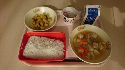 今日の献立は、ご飯、納豆、大学芋、石狩汁、牛乳でした。
