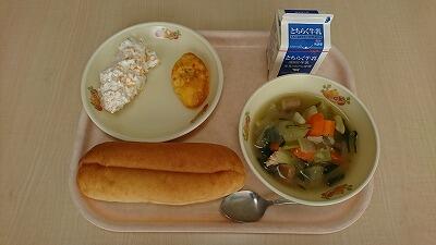 今日の献立は、フルーツクリームサンド(コッペパン、フルーツクリーム)、トマトミートオムレツ、ポトフ、牛乳でした。