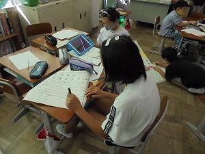 4年生の教室では、国語の時間に「新聞づくり」の仕上げをしていました。