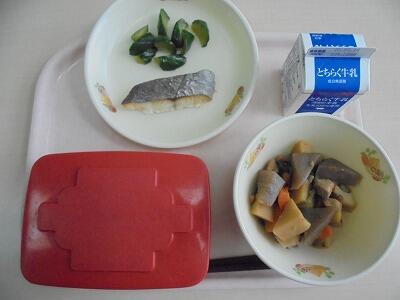 今日の給食の献立は、【ごはん・牛乳・ミナミカマスの塩焼き・筑前煮・きゅうりのコロコロ漬け】でした。