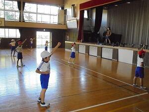 体育館で、ダンスの練習をしていました。担任の先生、支援の先生と共に一生懸命に練習しています。
