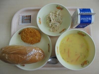 今日の給食の献立は、【コッペパン・牛乳・ツナサンドの具・かぼちゃのコロッケ・コーンポタージュ】でした。 今日は、セルフ・ツナサンドでした。