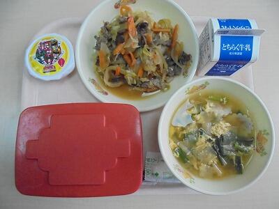 今日の給食の献立は、【わかめごはん・牛乳・太巻きたまご・おひたし・ぶた汁】でした。