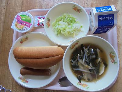今日の給食の献立は、【コッペパン・牛乳・ソーセージ・ボイルキャベツ・餃子スープ・シークワーサーゼリー】でした.