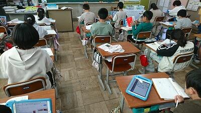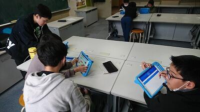 グループに分かれて、分かったことや感想をタブレットなどを使ってまとめています。